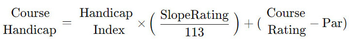 Course Handicap을 계산하려면 골퍼의 Handicap Index와 골프장의 Slope Rating, Course Rating을 기준으로 하며, 구체적인 공식은 다음과 같습니다: